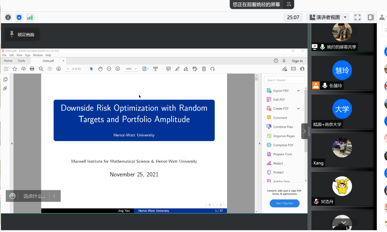 2021年11月25日下午2-4点,来自赫瑞瓦特大学统计精算系的姚经教授和广东外语外贸大学金融学院的姚海祥教授为我院师生详细介绍了带有下方风险控制的最优投资组合选择问题。