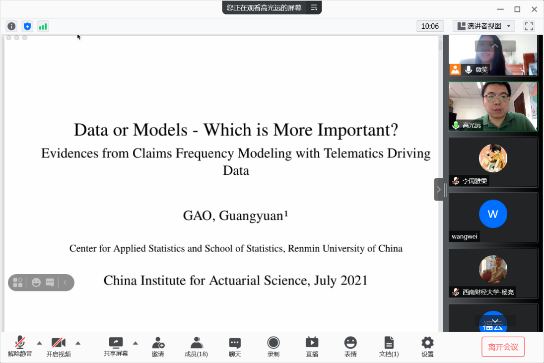 2021年7月2日上午,中国人民大学统计学院副教授、应用统计永利集团中心研究员高光远老师开启精算论坛活动第188期,为我院师生带来车险索赔中数据和模型的相对重要性的探讨。