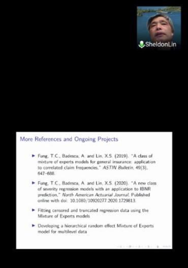 首先,林教授给大家讲解了他对于精算建模的个人认识,他认为建模需要基于数据,立足保险背景,不能过分强调数学的正确性。同时,精算模型应该具备灵活性、简约性、和可解释性。其次,他认为了解投保人风险对索赔次数和索赔额的影响,以及不同类型索赔之间的依赖关系,是制定保险费率和IBNR准备金的关键。为了准确地量化这种关系,他改进了简化混合专家模型,提出了logit加权简化版的混合专家模型(LRMoE)。最后,他的团队通过仿真研究和实际数据说明了模型的应用价值。他们用LRMoE模型拟合一家欧洲保险公司的多变量索赔频率数据,发现该模型能够从保险的角度来解释拟合,使投保人的信息与其风险水平之间的关系形象化,以及有助于制定保险费率。另外,它还能用于处理了具有重尾特征的保险损失数据。他表示,该模型适用于有效拟合报告延迟成分,这对于IBNR的充分预测是有用的且至关重要的。
