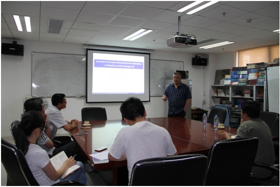 李效虎教授的主要研究领域是多元统计相依, copula理论及其在金融与精算风险管理中的应用, 在概率统计、运筹学、可靠性和计算机科学等领域的国际主流期刊上发表了110多篇研究论文。此次讲座,李教授主要介绍了他过去几年取得地若干研究成果,即借助随机置换单调性技术讨论k-out-of-n系统的寿命、最优投资组合、资本分配以及保险免赔额和上限的安排等问题。