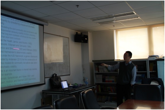 在整个报告过程中,Boda Kang教授一直与老师和同学有很好的交流,就建模方法以及统计分析手段等方面进行了深入地探讨。参加此次讲座的有来自我院的池义春、伍慧玲、刘芳达,金融学院的陈锐以及统计与数学学院的杨凤红、梁超等老师和同学。Boda Kang教授这次关于原油期货市场波动率结构的报告,不但让我们了解了原油期货市场不同于普通证券市场的特征,而且通过实证分析也向我们展示了不同的数值算法和统计方法如何应用到实际问题中。