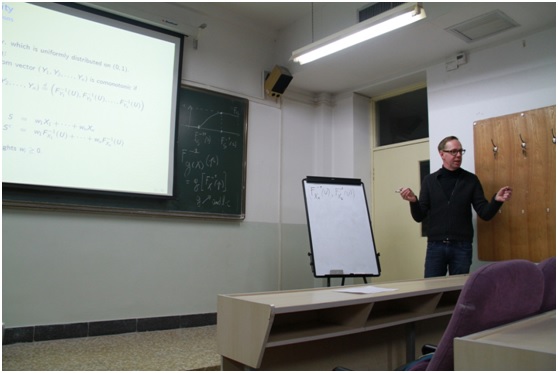 在本次授课过程中,Jan Dhaene教授结合自己丰富的学术研究经历,主要讲了精算和金融模型等内容,其中的参阅资料为Jan Dhaene主编的 《Actuarial and Financial Models》 一书。并讲述Index options: a model-free approach等相关问题。分别包括(1)Stocks, the market index and options(2)Convex order(3)Inverse cdf (4)Comonotonicity(5)The infinite market(6)The finite market六大部分内容。其中对第四部分同单调(Comonotonicity)进行了详细讲述,并通过引进大量示例进行论证。听众朋友们在提问环节也积极与Jan Dhaene教授互动交流, 进行国内外相关热点问题的交流。