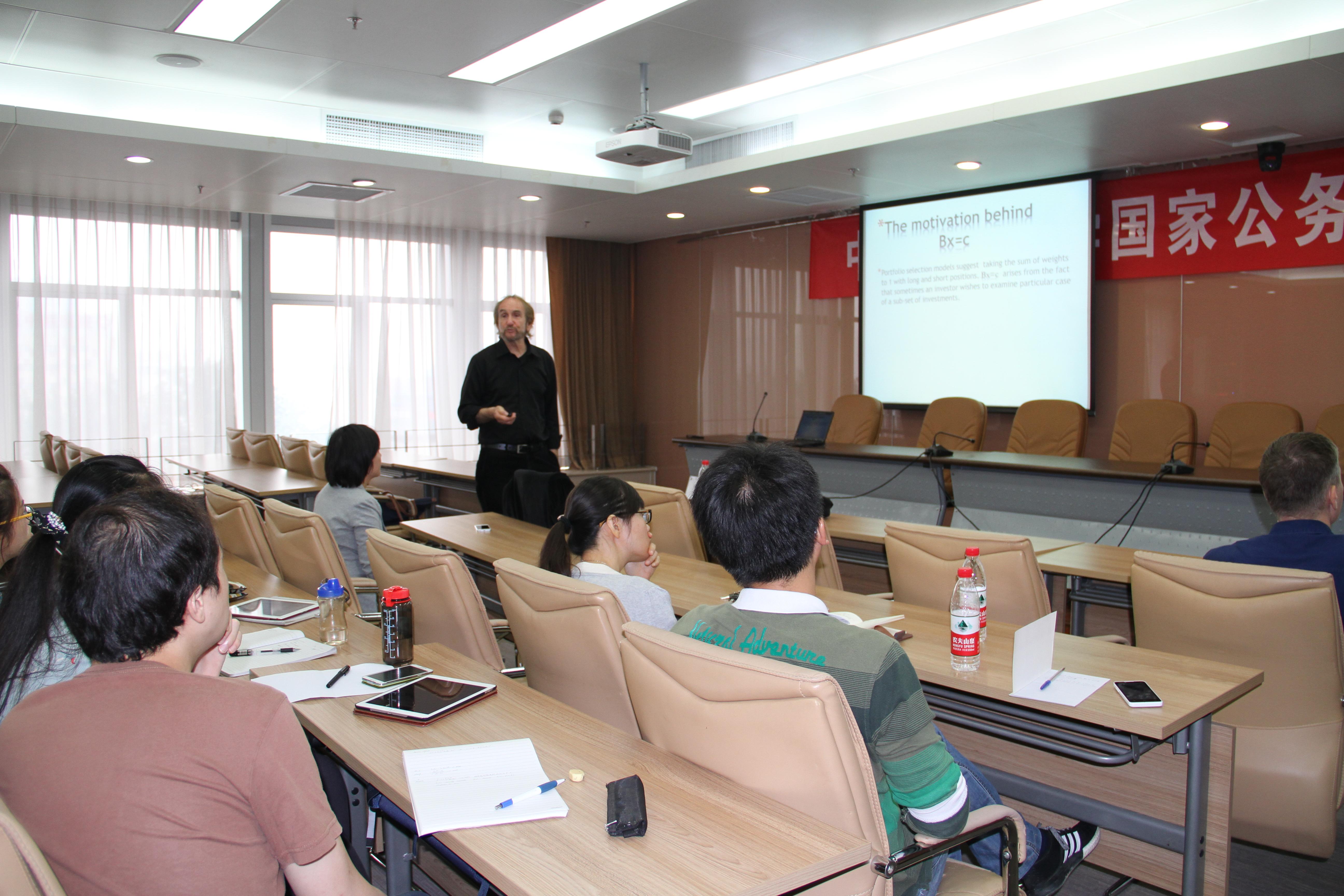 Nicolas Privault教授重点介绍了如何用基于Gamma分布和对数正态分布的分层估计法解决特定类型的期权定价问题,这类期权的共性为需要考虑风险资产在一段时间内的均价,如亚式期权及Dothan模型中的债券。另外Nicolas Privault教授介绍了目前学术界存在的其他处理方法如Laplace转换法,并通过和Laplace转换法的对比,呈现了分层估计法在效率和准确性上存在的优势。Udi Makov教授主要介绍了最优风险测度选择问题的一般方法,这在风险管理和金融投资领域都有着重要的意义。在讲座过程中,他详细介绍了几种风险测度方法,如Sharpe ratio,VaR,mean-variance等,并解释了如何在特定条件下选择最优风险测度。在互动环节,两位教授与师生就报告中提及的方法及模型展开了讨论,并对师生们的其他专业问题进行了详细的解答。
