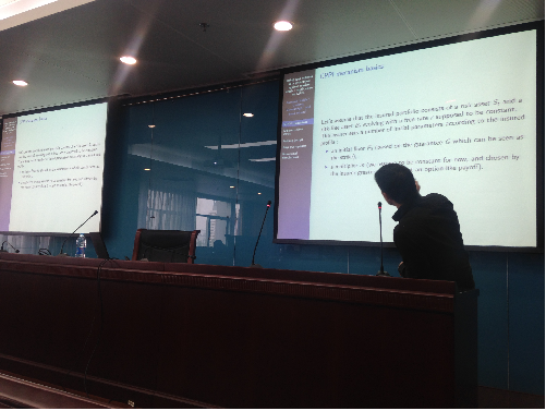 Ludovic Goudenege副研究员重点介绍了在CPPI投资策略中使用Gap Option对冲风险的思想。在讲座过程中,Ludovic Goudenege副研究员首先介绍了CPPI策略的原理,对比分析了使用看跌期权和Gap Option对冲风险的优劣,并解释说明了Gap Option在实务操作上的技术困难。在互动环节,Ludovic Goudenege副研究员与师生就如何决定CPPI策略中风险资本持有乘数m进行了深入讨论,并对同学们的其他专业问题进行了解答。